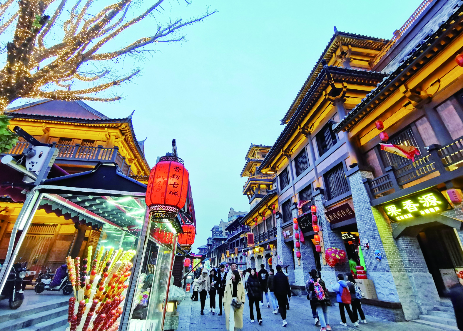 我市城區(qū)夜景亮化美化提升了城市形象,營造出一幅幅靚麗的風(fēng)景。圖為2019年12月30日晚,市區(qū)曹魏古城內(nèi)燈火通明,商鋪鱗次櫛比,市民漫步其間感受古城文化魅力,迎接新年的到來。 本報(bào)記者 喬利峰 攝