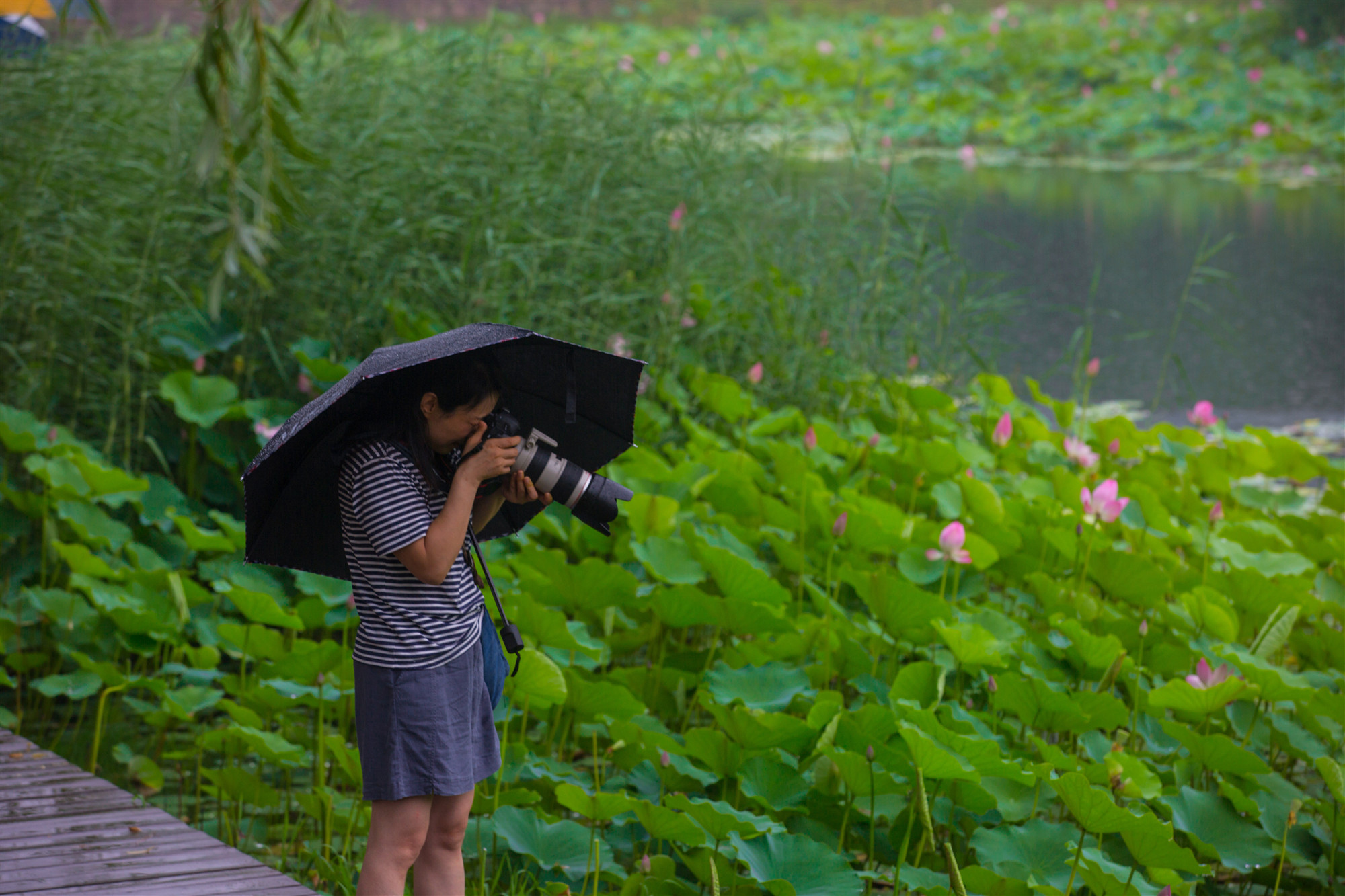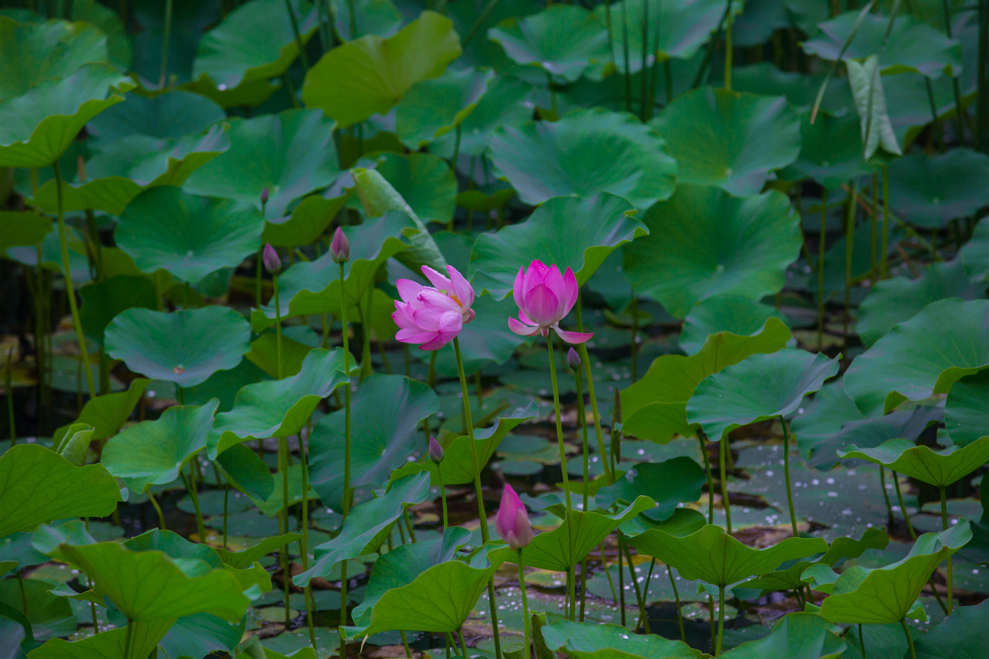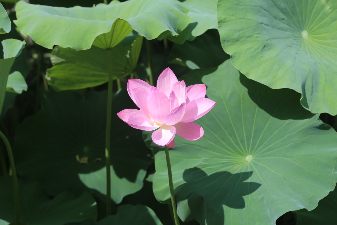 翠綠、渾圓、厚重的荷葉映襯得荷花格外亭亭玉立,像披著輕紗在湖中沐浴的少女,嬌羞頷首、盈盈欲滴。