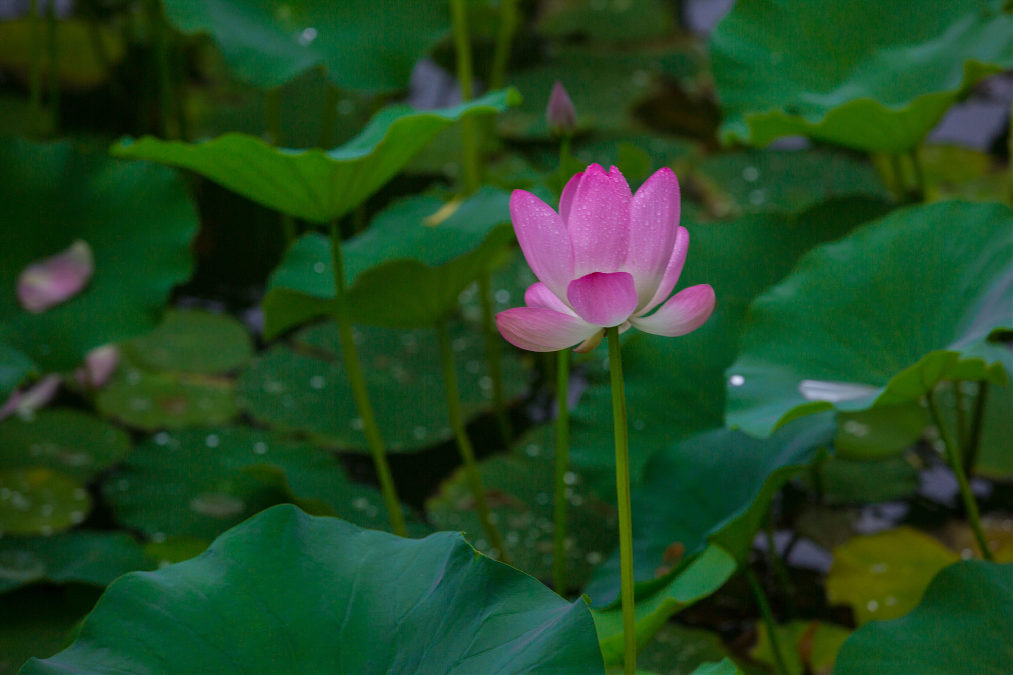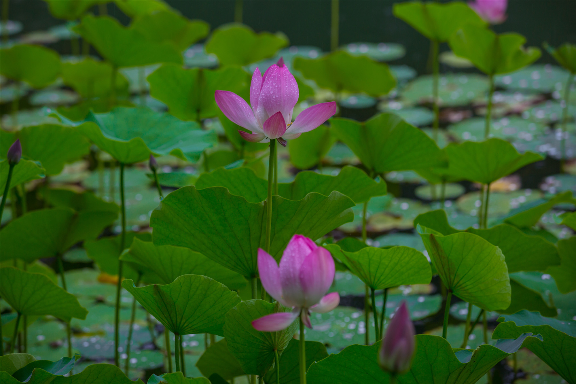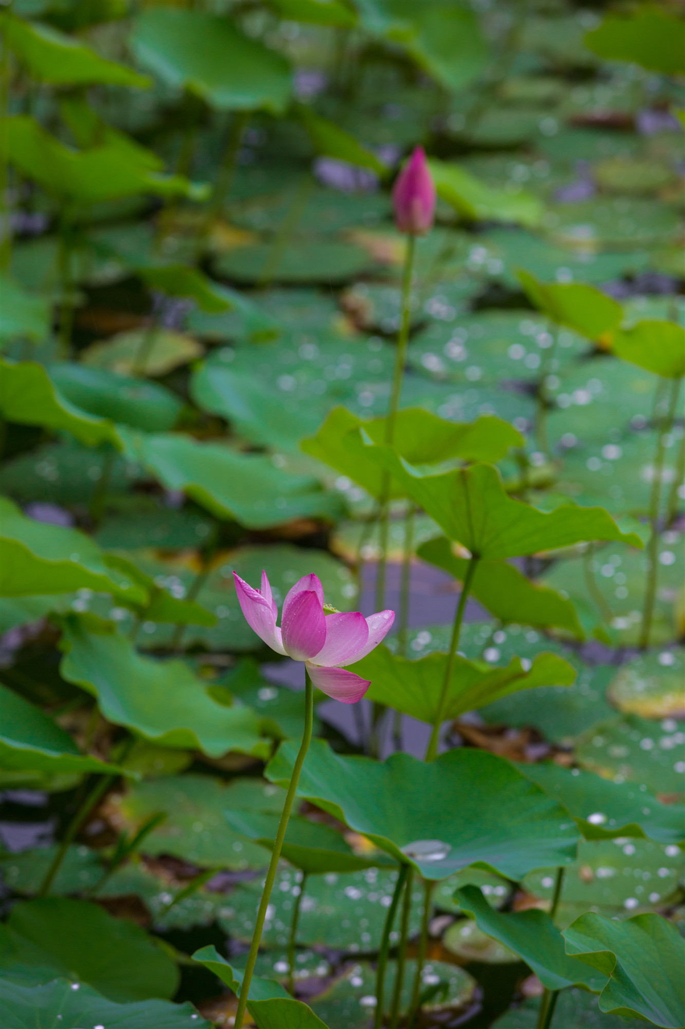 盈盈欲滴的荷花在濛濛細(xì)雨中嬌羞頷首。