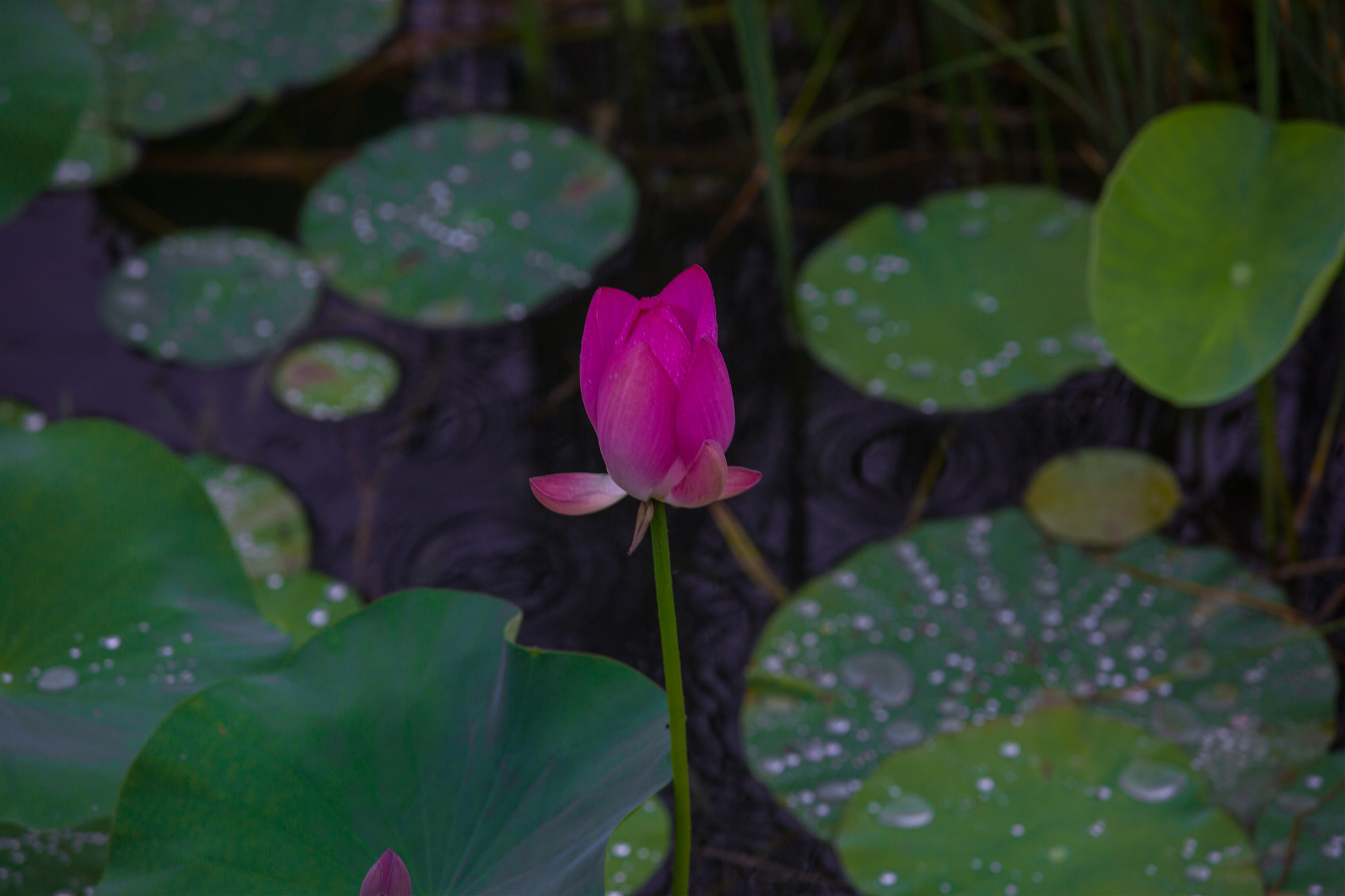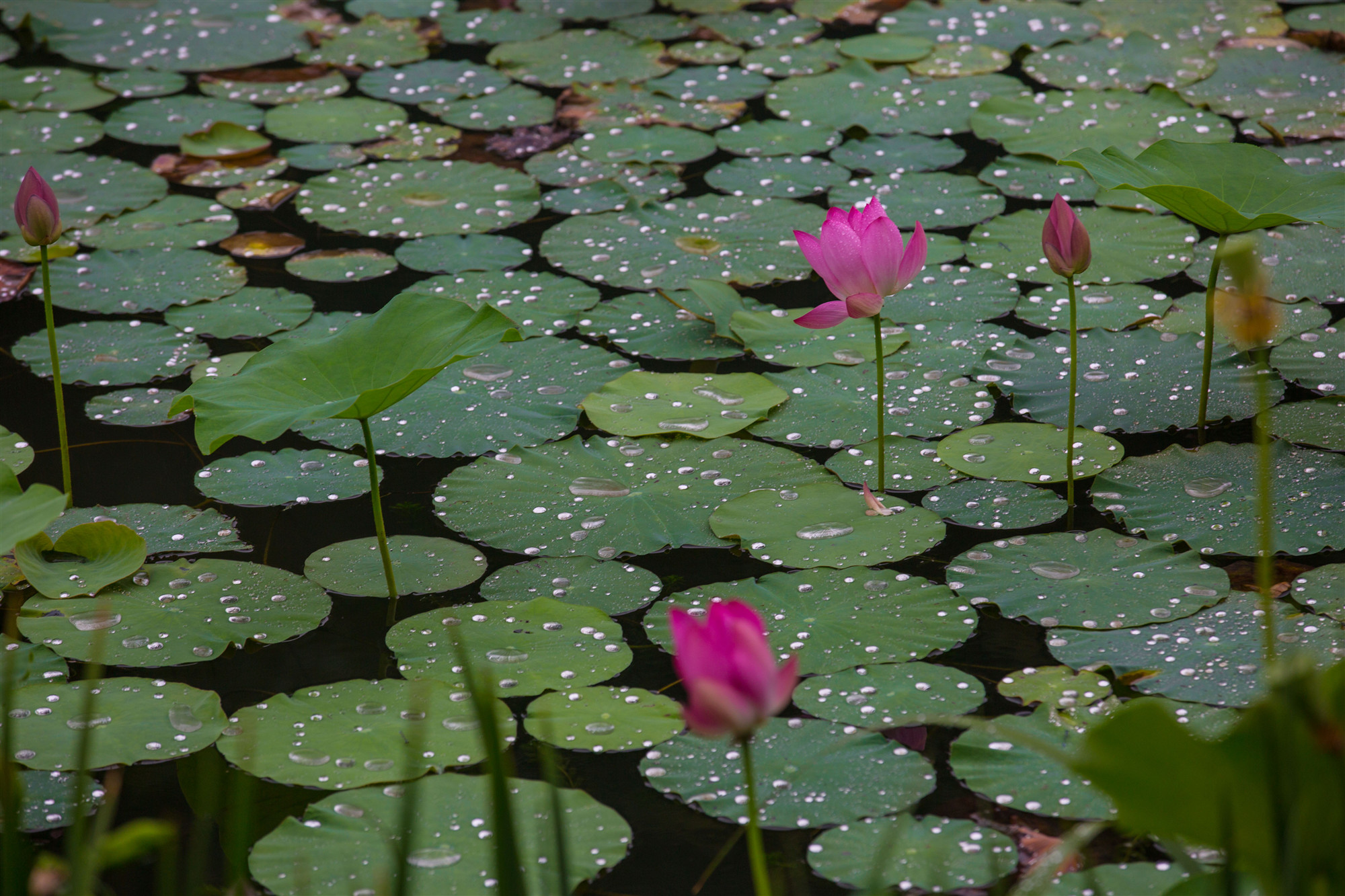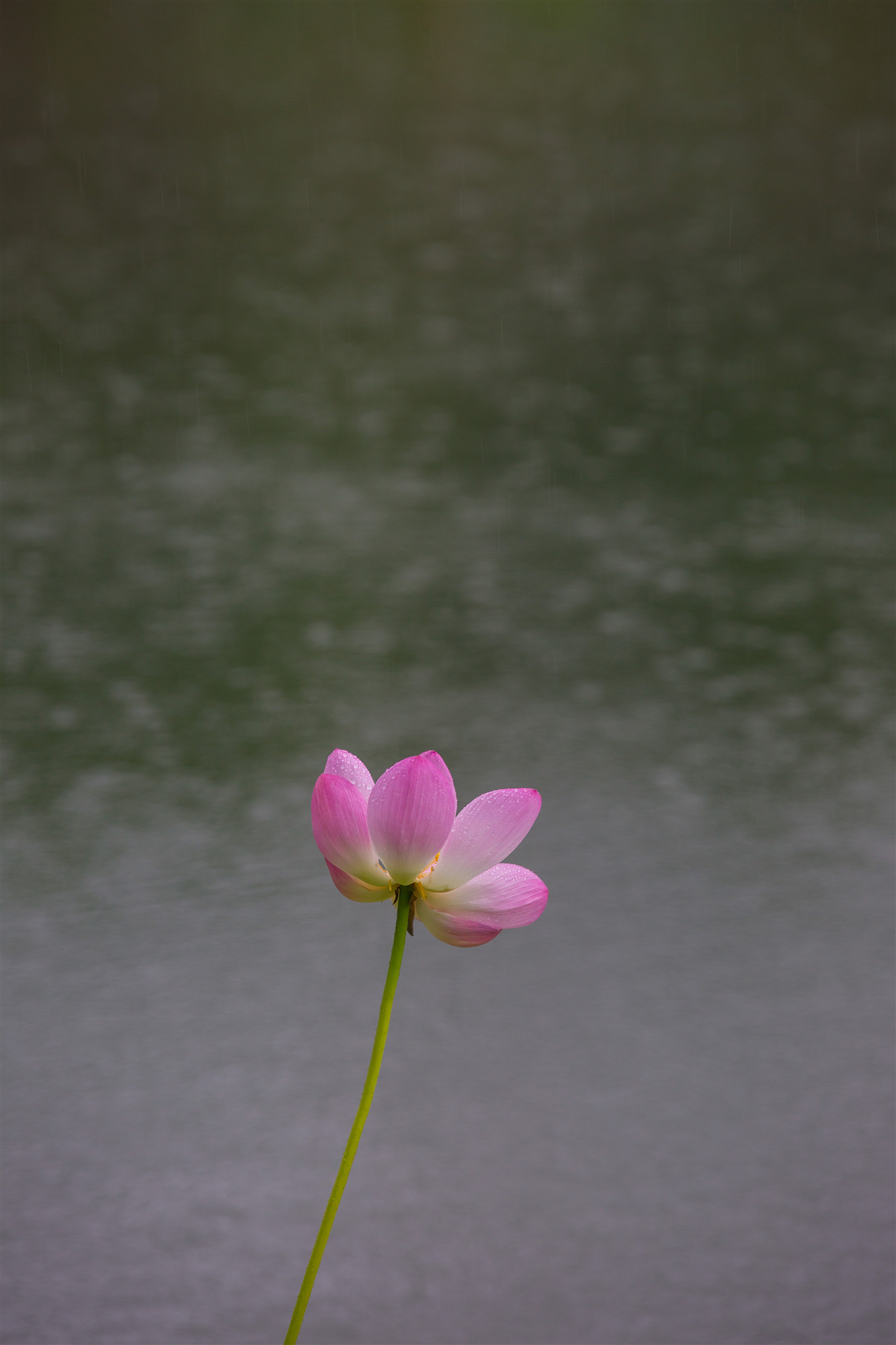 盈盈欲滴的荷花在濛濛細(xì)雨中嬌羞頷首。