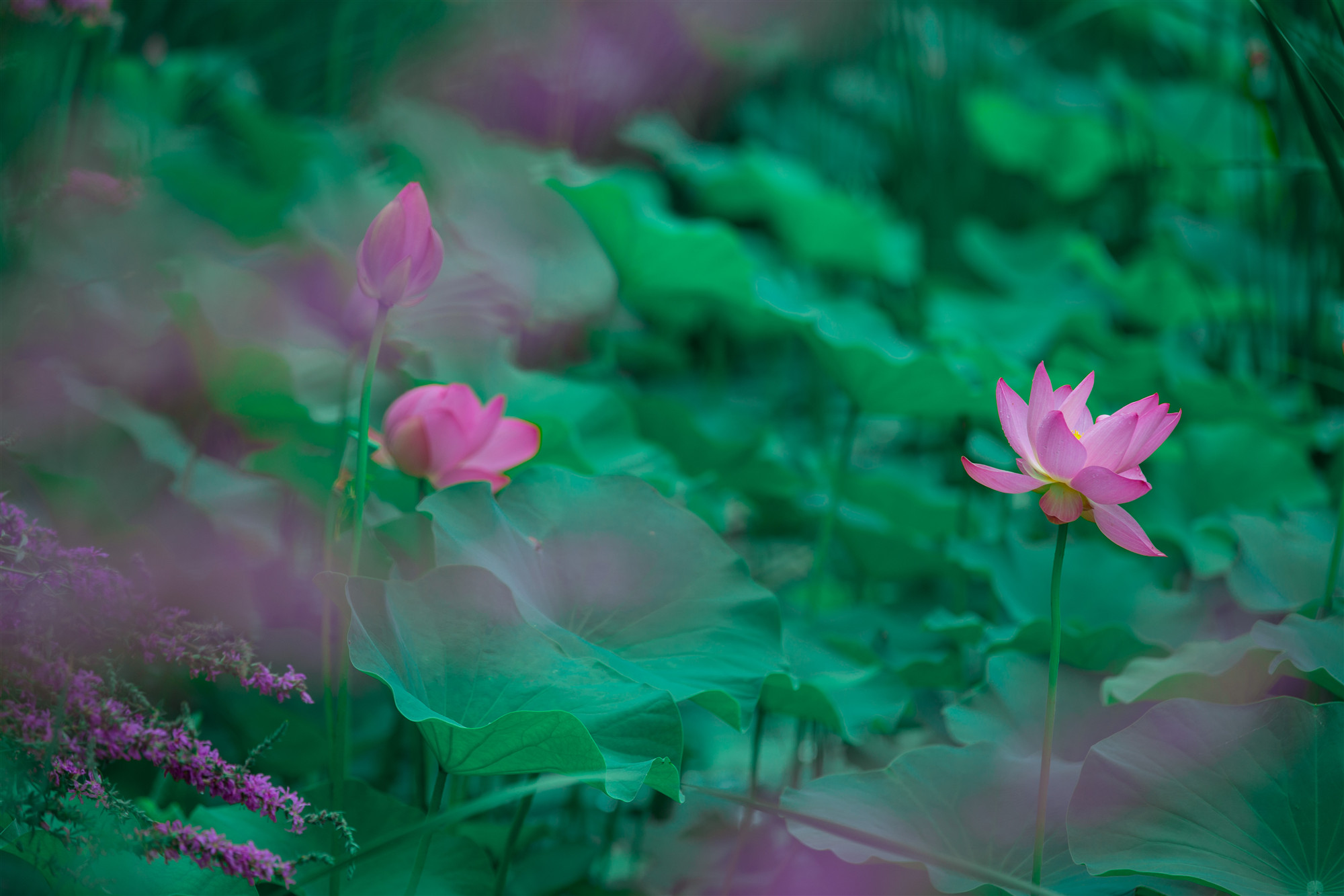 朵朵紅蓮、粉蓮,穿梭流連在青綠的荷葉間,清風(fēng)徐來(lái),陣陣花香撲鼻而來(lái)。