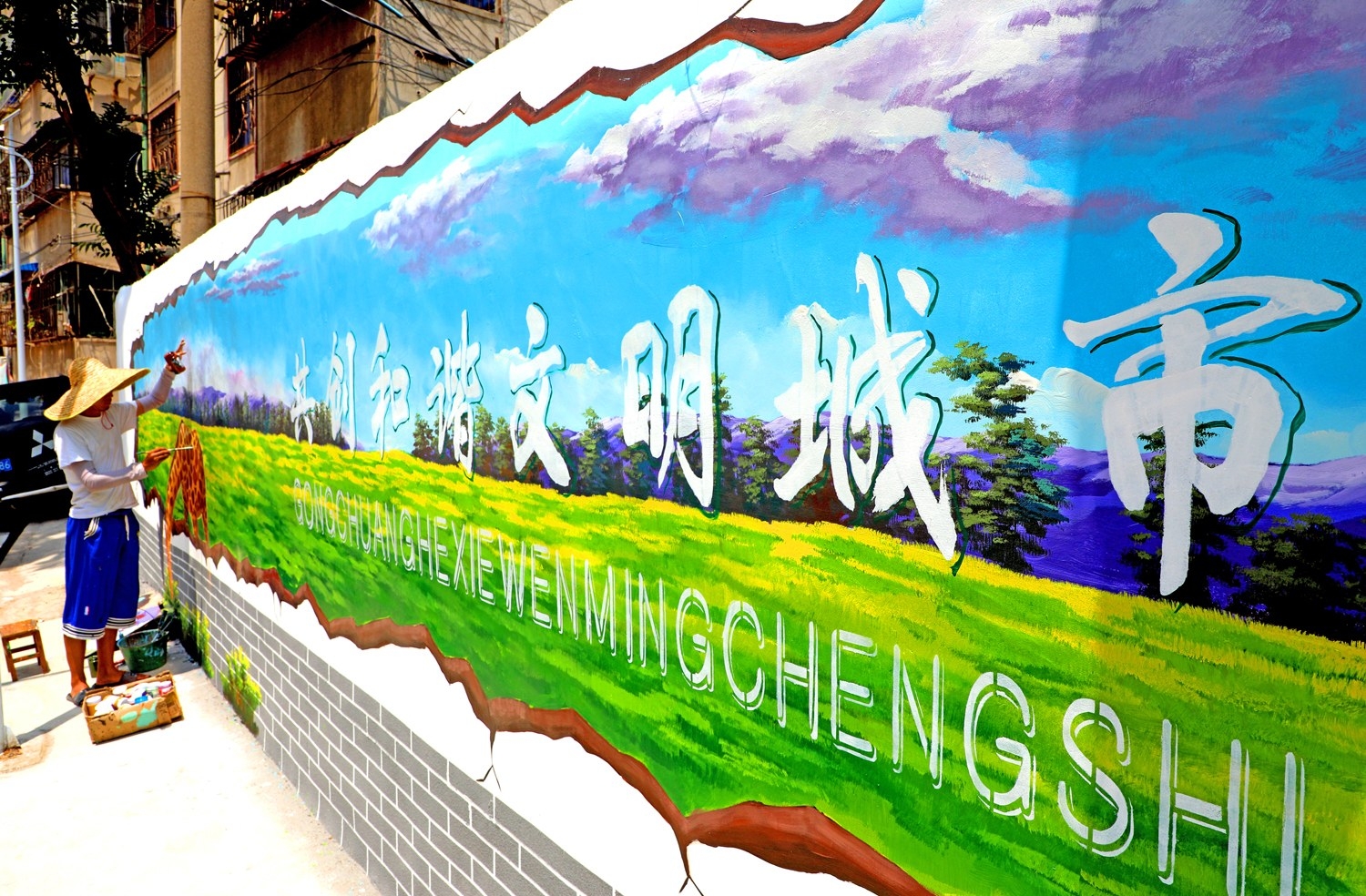 7月12日,墻體彩繪師正在市區(qū)倉庫路六一巷進行3D墻繪。