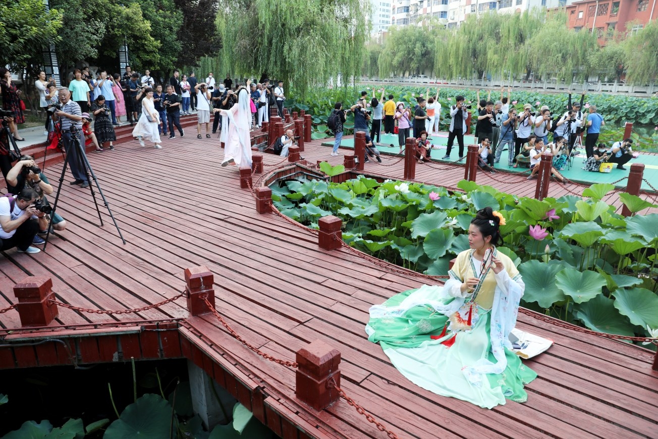 7月12日,市區(qū)護(hù)城河畔,攝影愛好者在拍攝荷花美景。隨著盛夏來臨,我市水系河道內(nèi)種植的荷花陸續(xù)盛開,吸引市民賞花拍照。 本報(bào)記者 喬利峰 攝