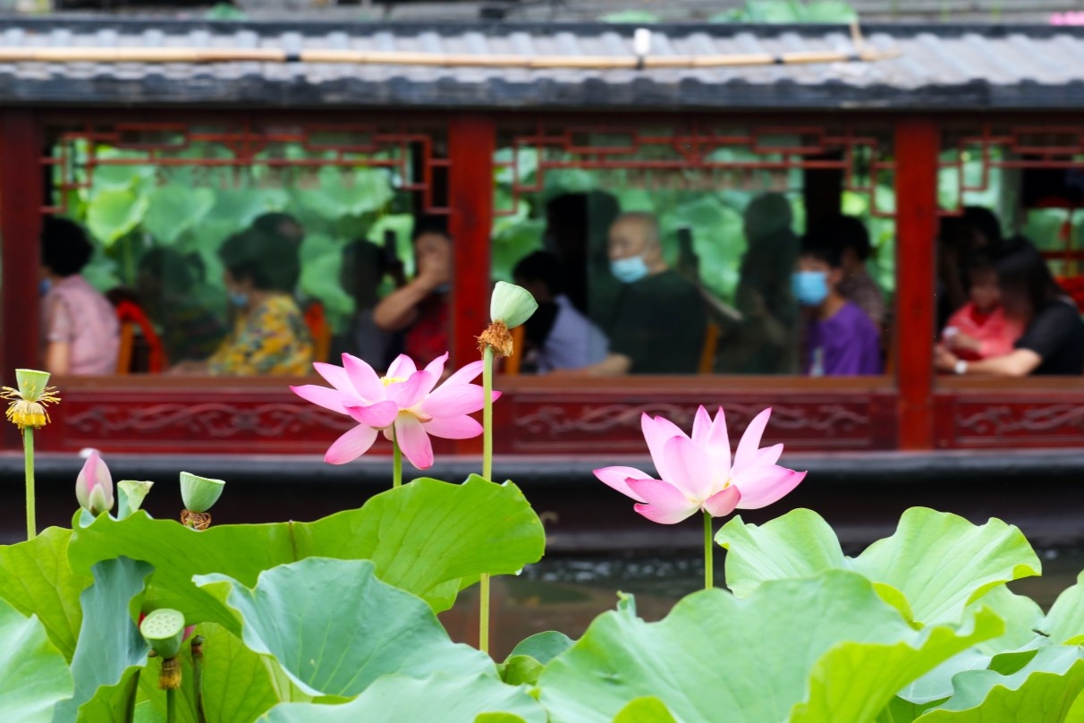 時(shí)下正是小暑時(shí)節(jié),市區(qū)護(hù)城河內(nèi)的荷花競(jìng)相開放,散發(fā)出陣陣清香,吸引眾多市民和游客泛舟湖面,前來觀賞。