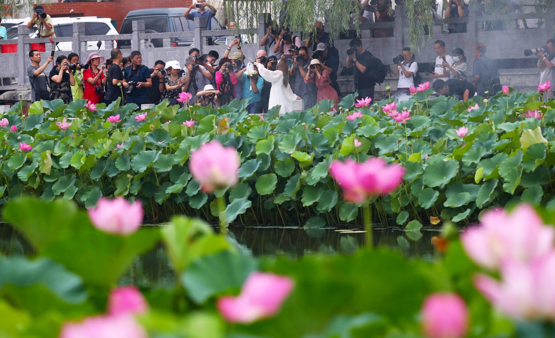 - •市區(qū)護(hù)城河畔,攝影愛好者在拍攝荷花美景