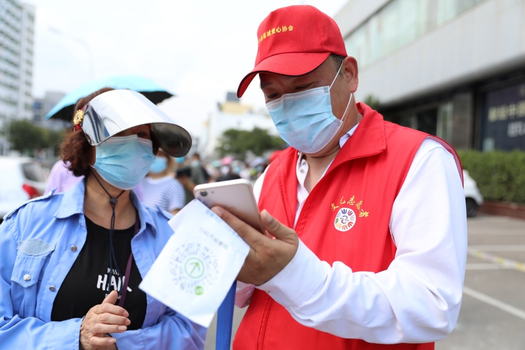 8月6日,志愿者在核酸檢測(cè)點(diǎn)幫助市民進(jìn)行數(shù)據(jù)輸入。