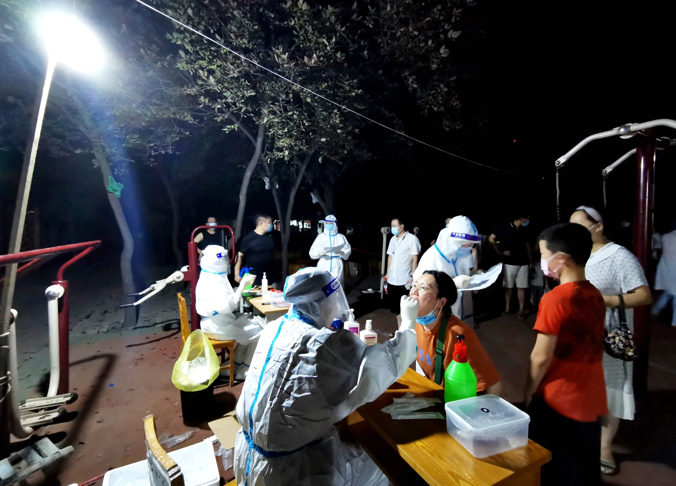 八月六日,一核酸檢測(cè)點(diǎn),醫(yī)務(wù)人員挑燈夜戰(zhàn)與病毒“賽跑”。