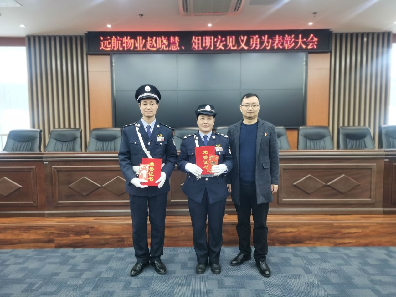 遠航物業(yè)黨支部表彰見義勇為員工趙曉慧(中)、俎明安(左)