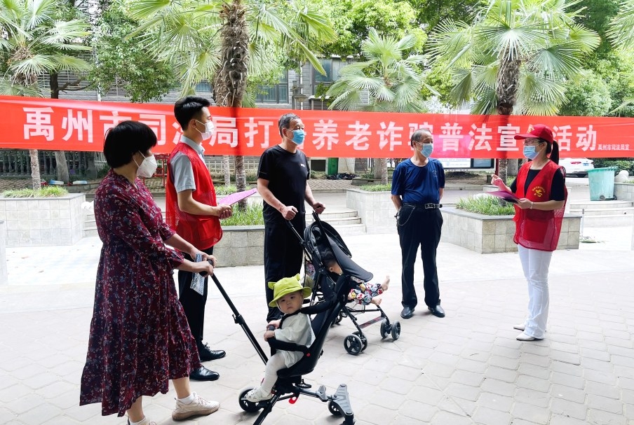 6月8日,禹州市司法局普法志愿者走進(jìn)社區(qū),向群眾發(fā)放防范養(yǎng)老詐騙宣傳手冊,提醒群眾勿輕信陌生人的花言巧語,不要抱有“占小便宜”的心理。韓曉雅 攝