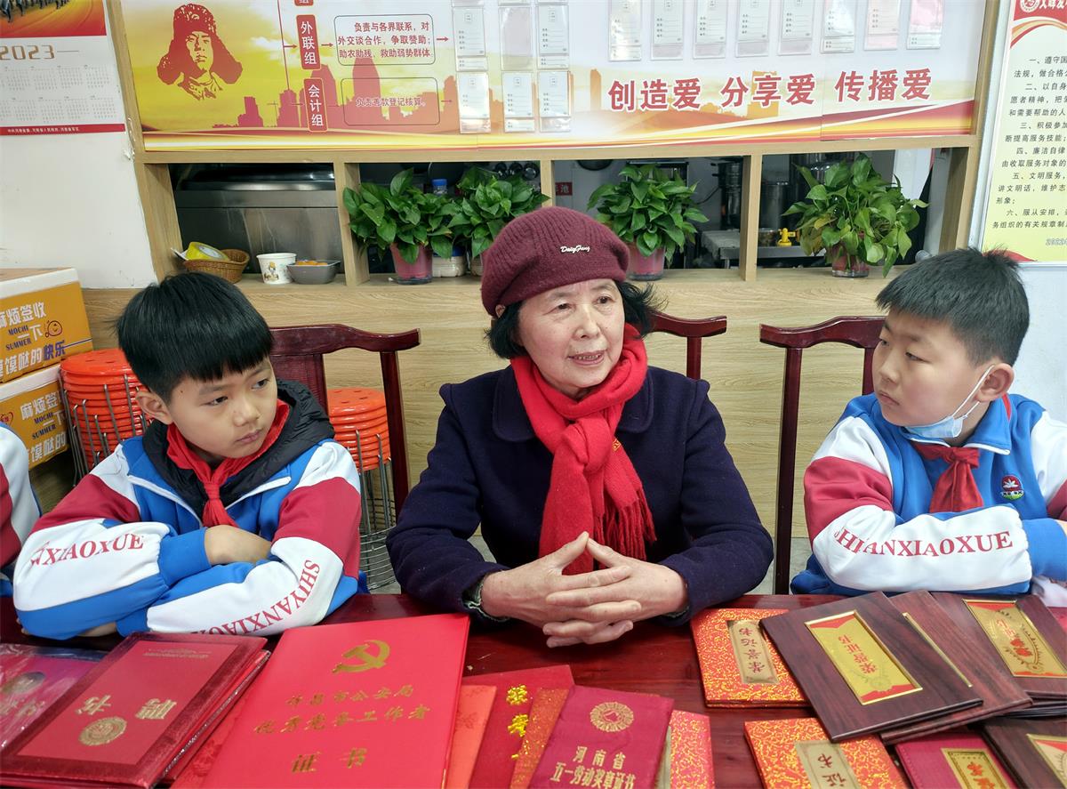 2月26日上午,在市區(qū)文峰社區(qū)愛(ài)心粥屋,黃玉棟給小學(xué)生講述當(dāng)年學(xué)雷鋒的經(jīng)歷。黃玉棟原是一名公安民警,在職時(shí),先后獲得“河南省學(xué)雷鋒標(biāo)兵”“河南省勞動(dòng)模范”等榮譽(yù)稱號(hào)。退休后,她又到市老干部督導(dǎo)團(tuán)繼續(xù)為城市創(chuàng)建貢獻(xiàn)力量。 記者 黃增瑞 攝