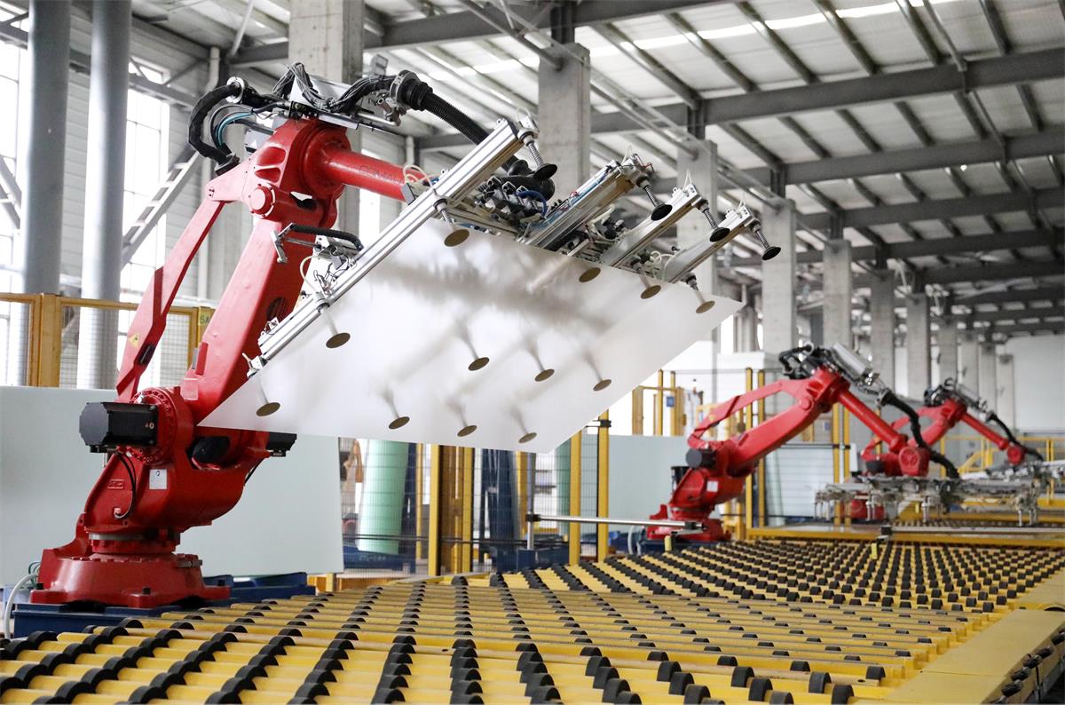 5月4日,位于襄城縣的安彩新能科技有限公司,機器人在自動化生產(chǎn)線上有序作業(yè)。該公司針對玻璃行業(yè)危險系數(shù)高、重復性較強的工藝特點,實行工藝全流程自動化,大幅提高了生產(chǎn)效率,可年產(chǎn)光伏輕質(zhì)基板4800萬平方米。 本報記者 喬利峰 攝