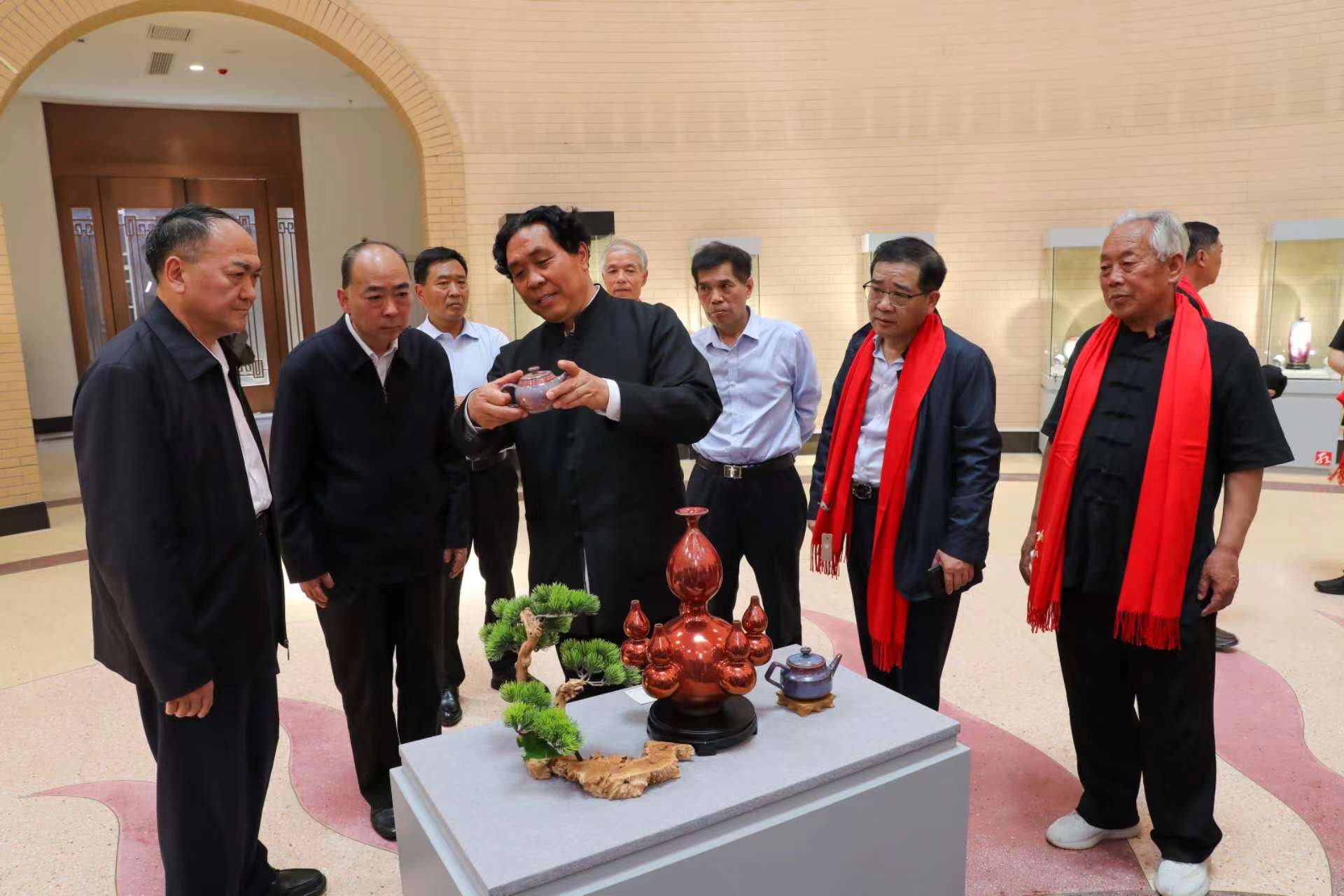 5月13日,“大道天成——孔相卿大師從藝45年成就展”在中國鈞瓷文化園開幕。本次展覽分五大板塊共展出100多件作品,分別是孔相卿大師從藝45年來,在不同時期創(chuàng)作的具有不同風(fēng)格的代表性作品,彰顯出大師深邃的思想境界和高超的藝術(shù)水準,喚起人們對文化、藝術(shù)、自然、傳統(tǒng)以及東西方藝術(shù)表達與融合等多視角全方位的思考,有著極高的文化和藝術(shù)感染力。圖為孔相卿(前排左三)向參觀者介紹自己的作品。 圖片由孔相卿本人提供