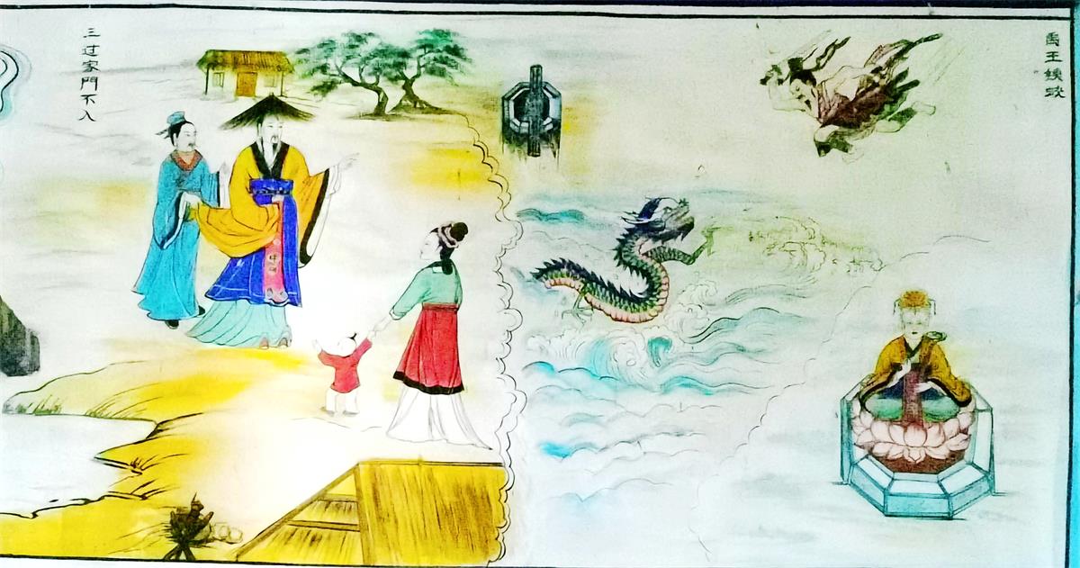 禹王殿的四壁繪滿了大禹傳說故事:禹王鎖蛟、化身黃熊、夏啟誕生、牛王邀功……畫面頗為精美。
