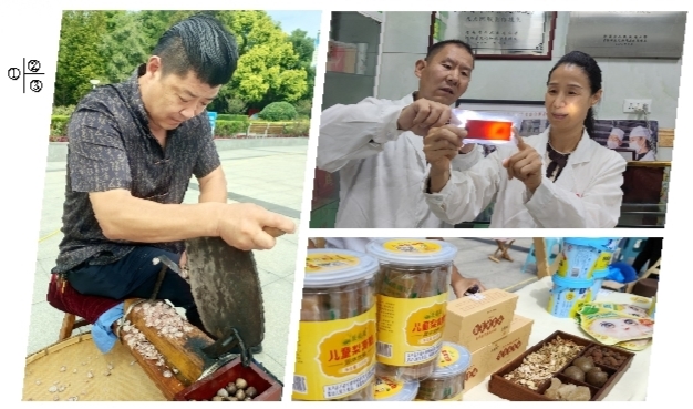 ①非遺傳承人李彥鋒在展示中醫(yī)切片技藝 ②省級非物質(zhì)文化遺產(chǎn)九天阿膠制作技藝代表性傳承人趙向陽(左) ③禹州市中醫(yī)藥企業(yè)展示生產(chǎn)的產(chǎn)品