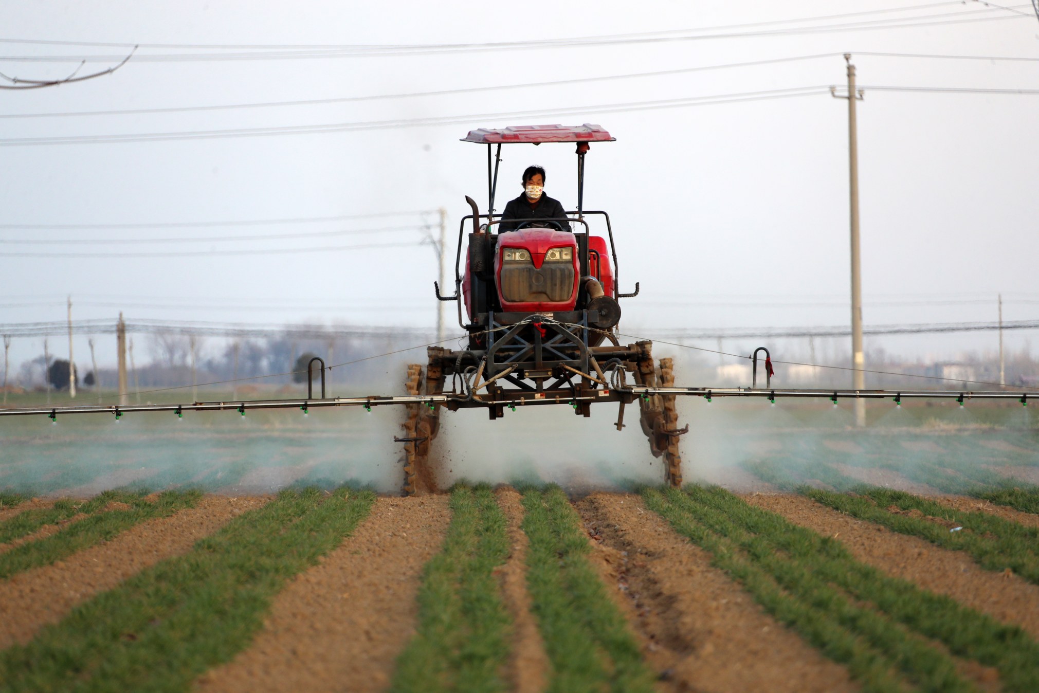 2月15日,在建安區(qū)陳曹鄉(xiāng)陳曹村的高標(biāo)準糧田示范園區(qū)內(nèi),農(nóng)民駕駛自走式噴桿噴霧機對小麥進行田間管理。本報記者 牛書培 攝