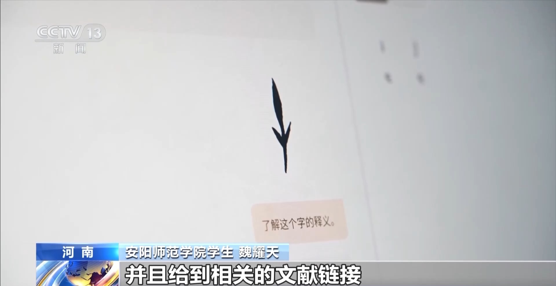 安陽(yáng)師范學(xué)院學(xué)生 魏耀天:以前在大幾千的文獻(xiàn)里面去查找具體的某一個(gè)文字,非常麻煩。但是我們用這個(gè)甲骨文智能體,就能給我們顯現(xiàn)出來(lái),并且給到相關(guān)的文獻(xiàn)鏈接,非常方便。